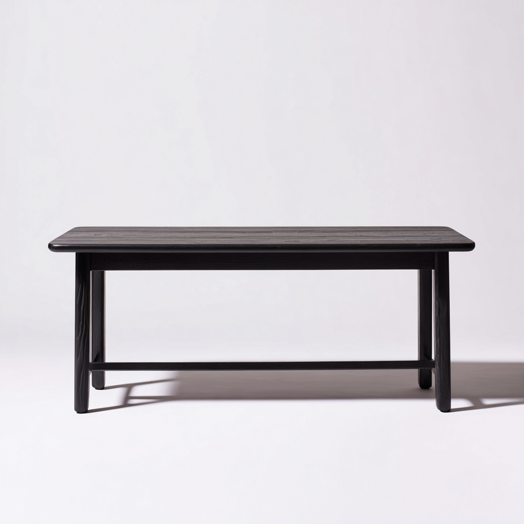 Der Tisch besteht aus Holz mit einer fein strukturierten schwarzen Oberfläche. Die geraden Tischbeine und die zusätzliche Querverstrebung sorgen für eine robuste Konstruktion und langlebige Stabilität.