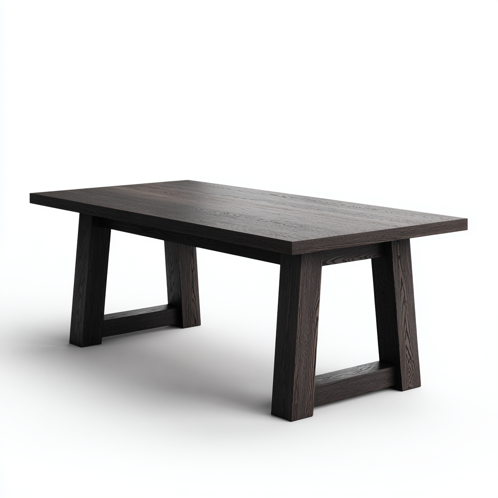 Der Tisch besteht vollständig aus Holz mit einer dunkel gehaltenen Oberfläche, die die natürliche Struktur dezent hervorhebt. Die verstärkte Rahmenkonstruktion gewährleistet hohe Stabilität und langfristige Haltbarkeit.