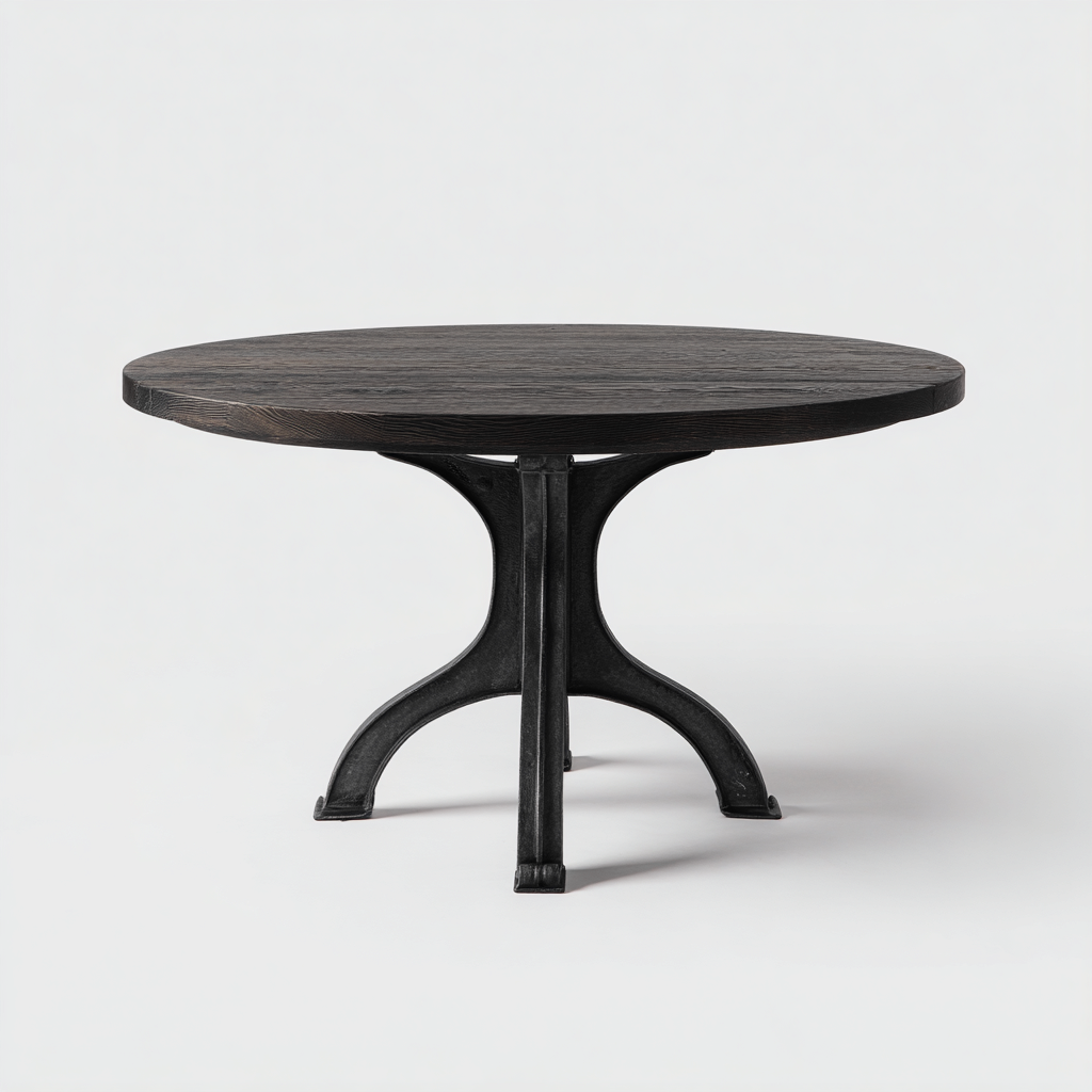 Dieser moderne Esszimmertisch kombiniert eine runde Tischplatte in dunkler Holzoptik mit einem robusten, skulptural geformten Metallgestell. Das markante Design verbindet natürliche Wärme mit industrieller Stabilität und eignet sich hervorragend für moderne Esszimmer, Wohnküchen und stilvolle Wohnbereiche.