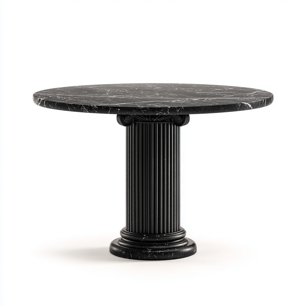 Die Tischplatte präsentiert eine realistische schwarze Marmoroptik mit feinen weißen Maserungen. Der mittige Säulenfuß ist in Holzoptik gefertigt und zeigt eine vertikale Rillenstruktur, die nicht nur stabilen Halt bietet, sondern auch ein klassisch-modernes Erscheinungsbild schafft. Alle Oberflächen sind glatt, robust und pflegeleicht.