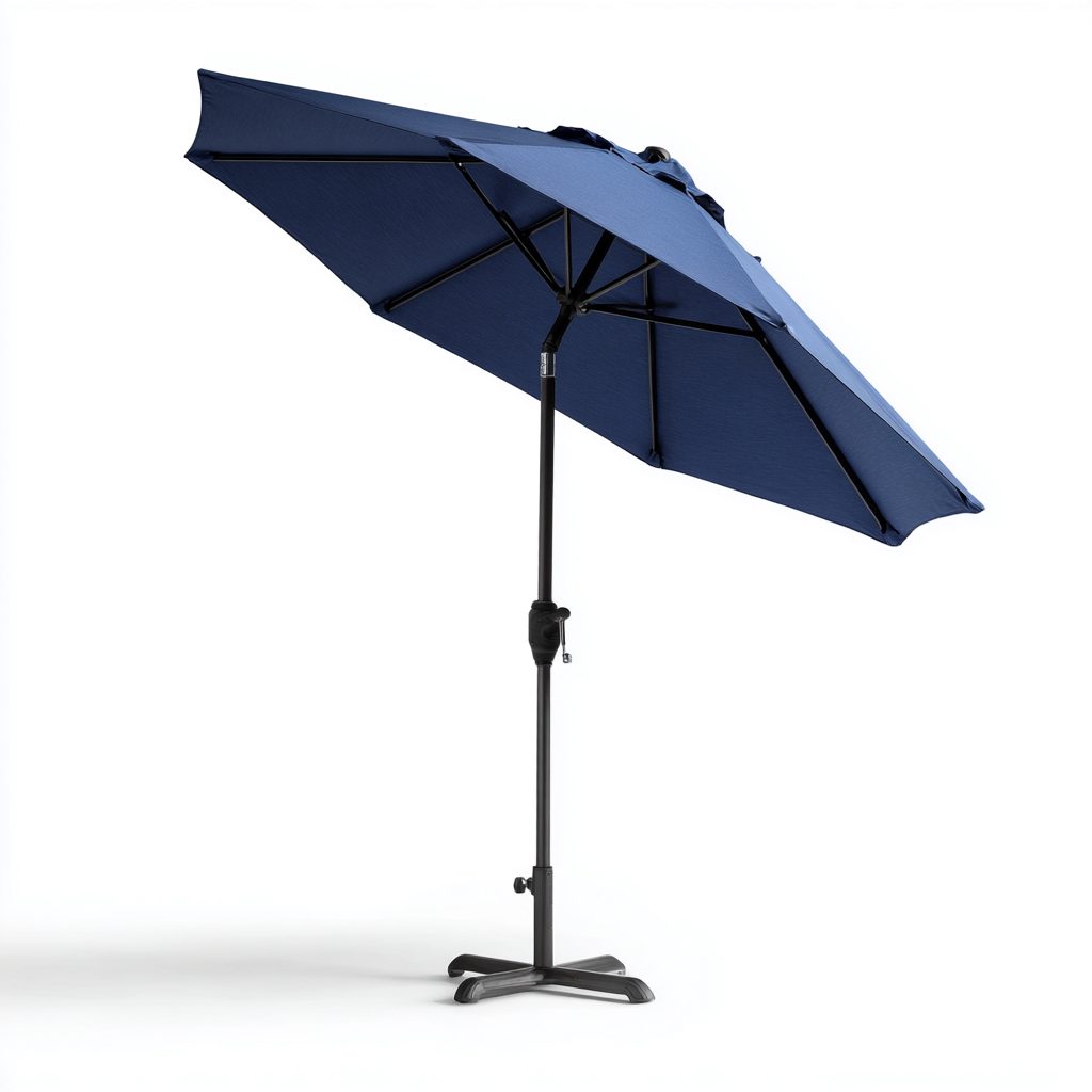 Der Schirm besteht aus dunkelblauem Textilgewebe sowie einem robusten Metallgestell und einem Kreuzfuß, der Halt und Flexibilität beim Aufstellen bietet.