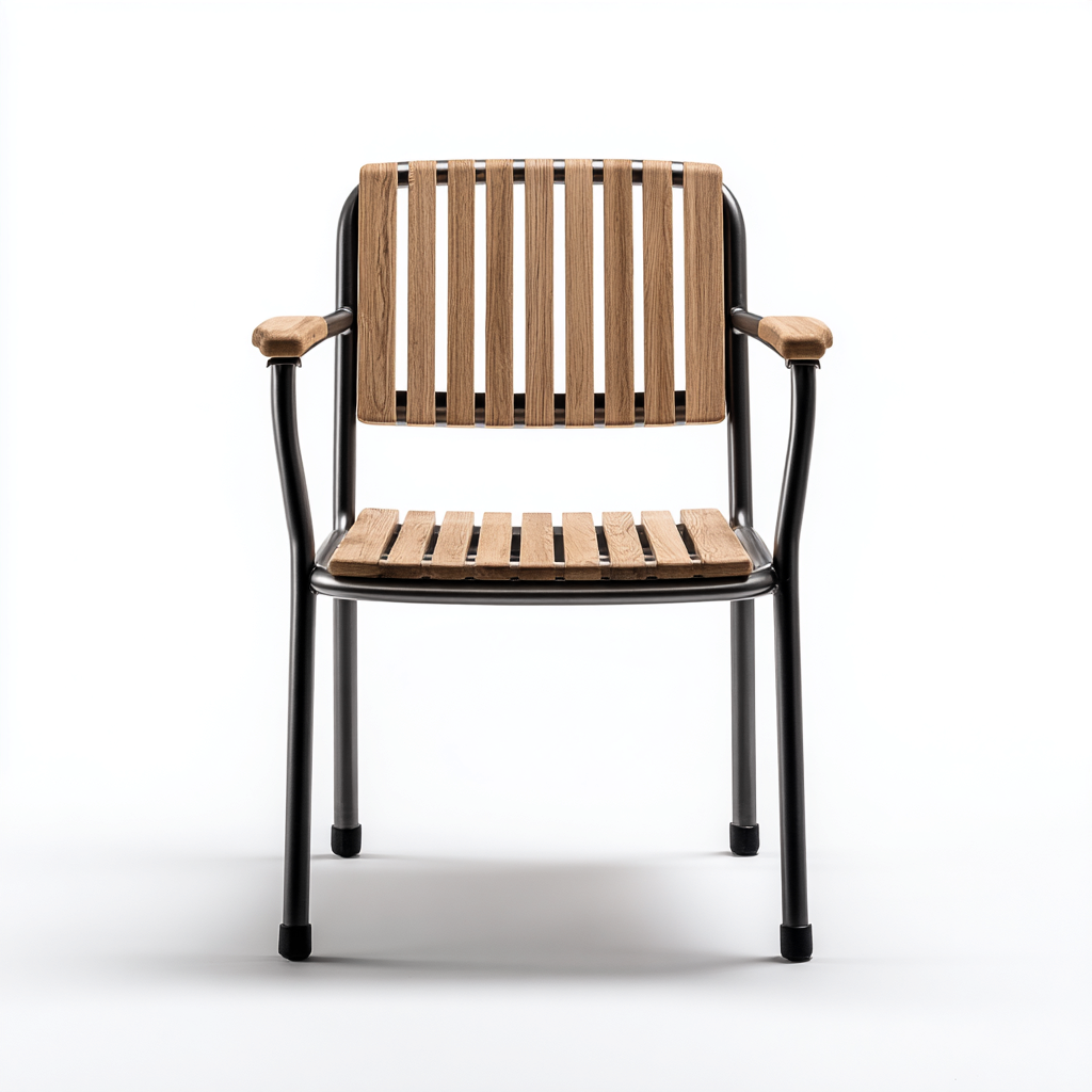 Der Stuhl besteht aus einem schwarzen Metallgestell und hochwertig verarbeiteten Holzlatten in Naturfarbe.Die Materialien sind wetterbeständig und für den dauerhaften Außeneinsatz geeignet.