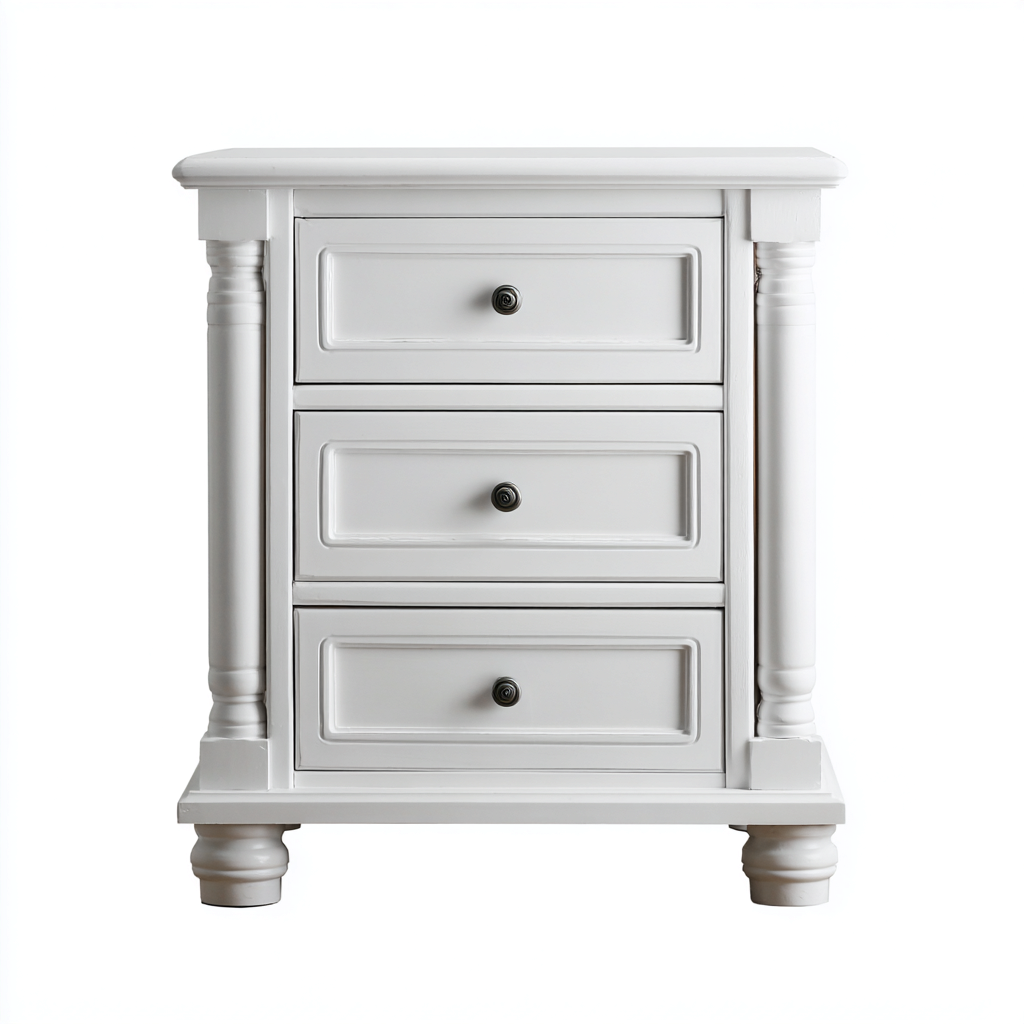 Dieser klassische Nachttisch vereint elegante Linienführung mit hochwertigen dekorativen Details. Die weiße Oberfläche und die gedrehten Stützsäulen verleihen dem Möbelstück eine traditionelle, harmonische Ausstrahlung. Mit drei Schubladen bietet der Nachttisch reichlich Stauraum für persönliche Gegenstände im Schlafzimmer.