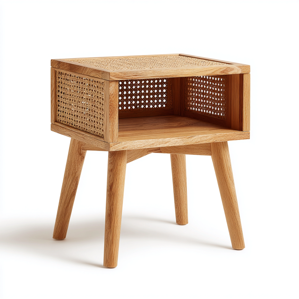 Dieser Nachttisch im skandinavischen Stil kombiniert natürliche Holzoptik mit seitlichen Geflecht-Elementen und bietet eine offene Ablagefläche für den täglichen Gebrauch. Das kompakte Design eignet sich ideal für Schlafzimmer und kleine Wohnräume.