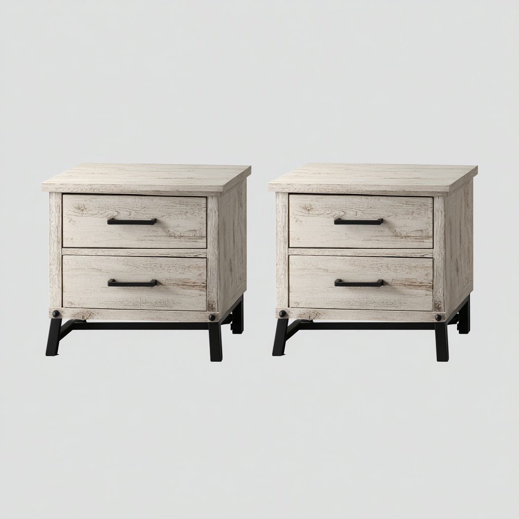 Zwei leichtgängige Schubladen pro Nachttisch ermöglichen eine organisierte Aufbewahrung persönlicher Gegenstände. Die robuste Konstruktion gewährleistet festen Stand und eignet sich ideal als Ergänzung zu modernen und industriell eingerichteten Schlafzimmern.