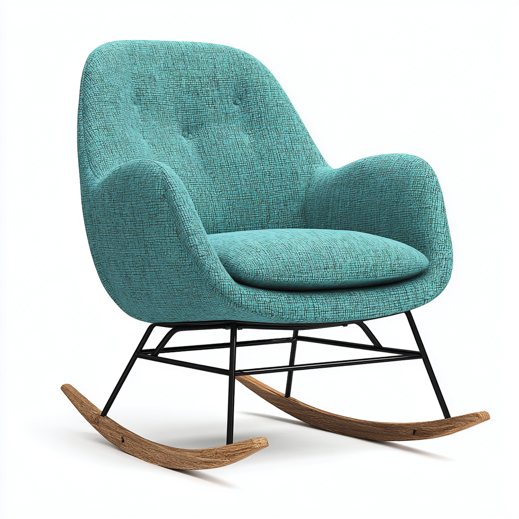 Der Schaukelstuhl ist mit einem türkisfarbenen Stoff bezogen, der eine angenehme Struktur und Haptik bietet. Das Untergestell besteht aus robustem Metall, während die Holzkufen aus hochwertigem Holz gefertigt sind und ruhige Schaukelbewegungen ermöglichen.