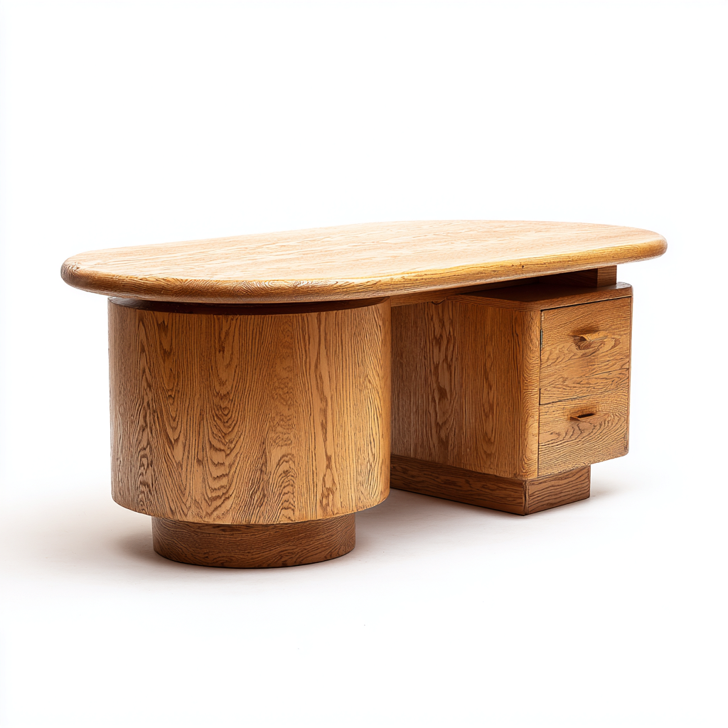 Dieser Schreibtisch aus Holz zeichnet sich durch seine weichen Rundungen und die markante ovale Tischform aus. Die solide Basis und die geschlossene Struktur verleihen dem Möbelstück eine hochwertige Präsenz für Büro- und Arbeitsräume.