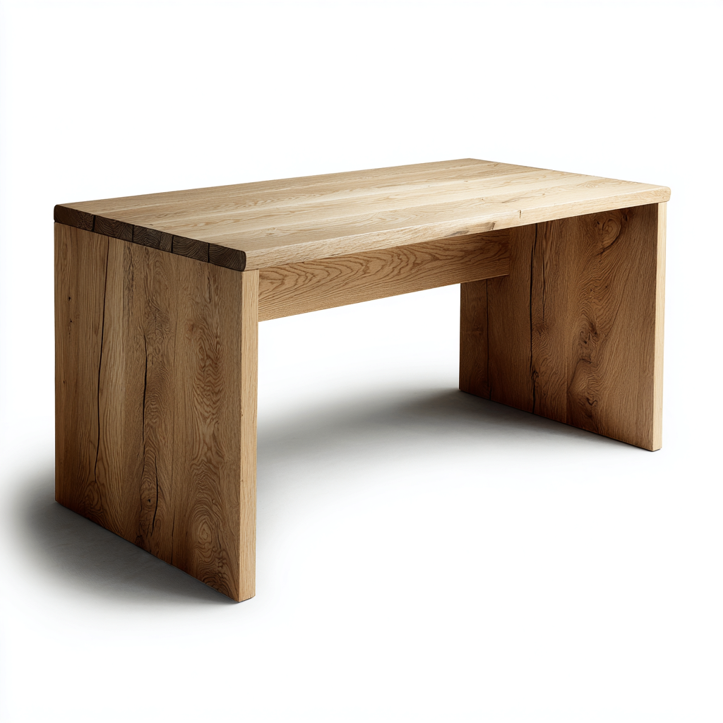 Dieser Schreibtisch aus Massivholz überzeugt durch seine schlichte und kraftvolle Formensprache. Die durchgehenden Holzplatten an den Seiten und die robuste Tischplatte erzeugen eine klare, stabile Struktur, die ideal für Arbeits- und Lernumgebungen geeignet ist.